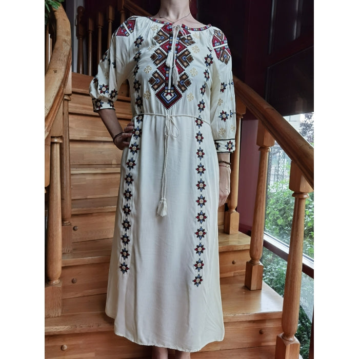Această rochie aduce în prim-plan frumusețea portului tradițional românesc printr-un design elegant, completat de broderii geometrice multicolore, inspirate din simbolistica populară.