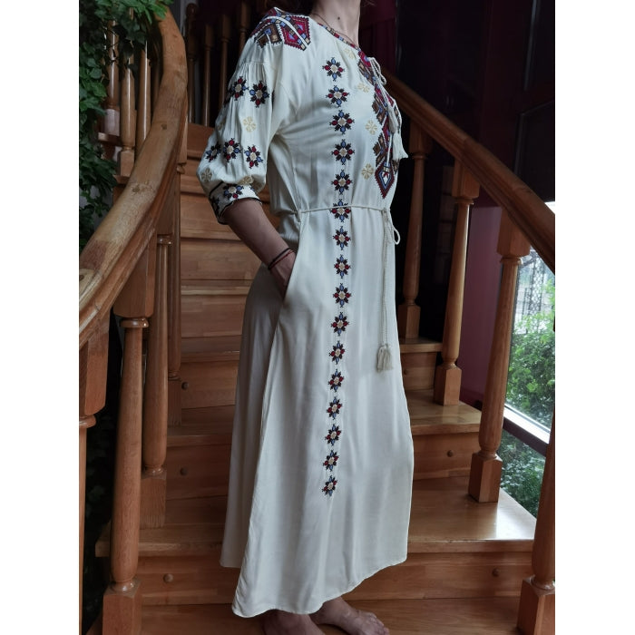 Confecționată dintr-o țesătură ușoară și fluidă, rochia este ideală pentru zilele călduroase sau evenimentele cu tematică autentică. Are o croială lejeră, mâneci trei sferturi și un cordon reglabil în talie care permite ajustarea siluetei. Gulerul rotund este decorat cu șnur și ciucuri, oferind o notă boemă.
