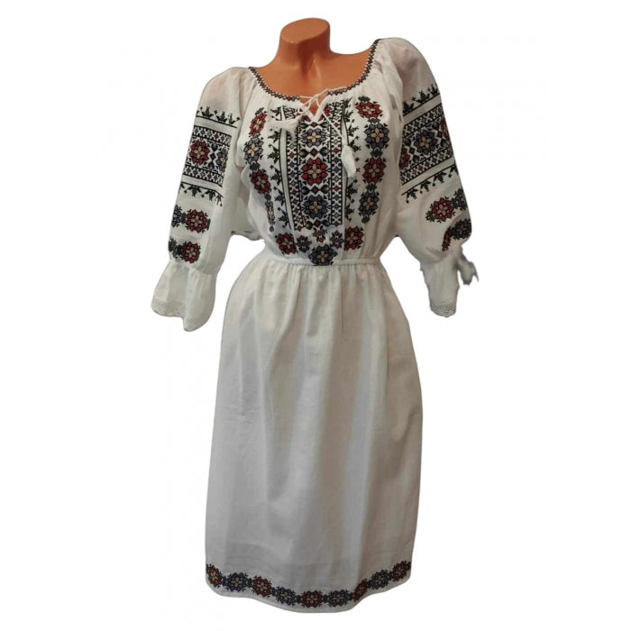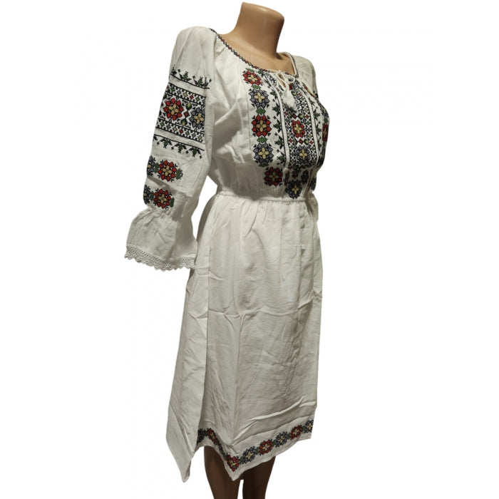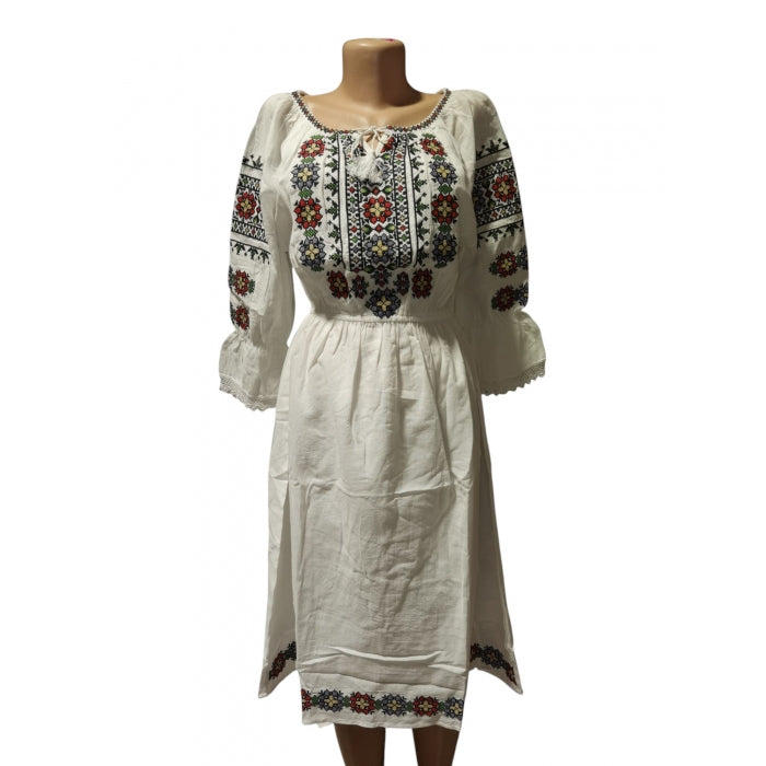 Rochie tradițională românească albă cu motive florale brodate – S până la 3XL