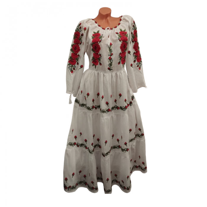 Descoperă frumusețea autenticității românești cu această rochie tradițională, brodată manual cu motive florale de inspirație populară. Fabricată din bumbac 100%, această rochie este ideală pentru a celebra tradițiile românești, oferindu-ți confort și eleganță în același timp.