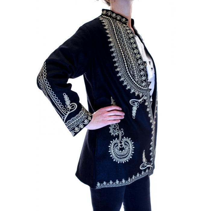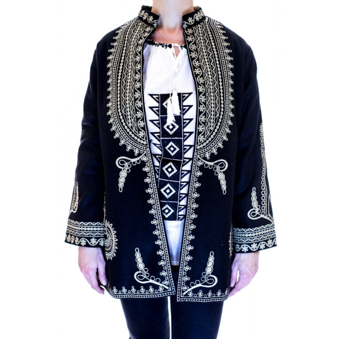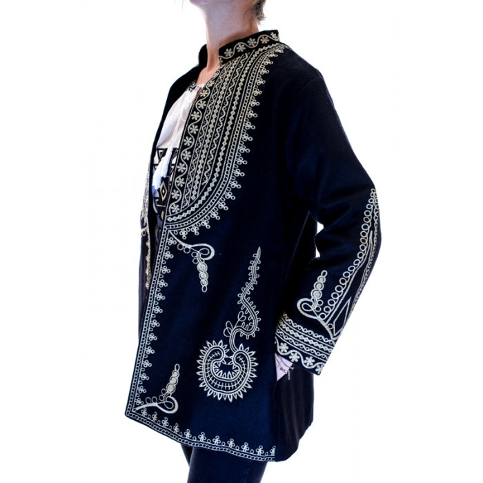 Sacou lung si drept, din stofa cu 58% lana in compozitie, captuseala din bumbac, buzunare laterale broderia de culoare bej..