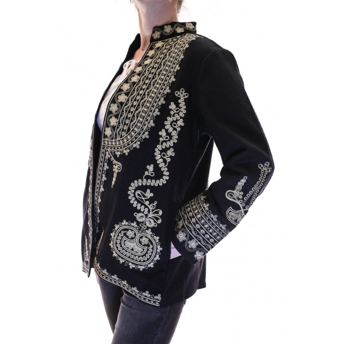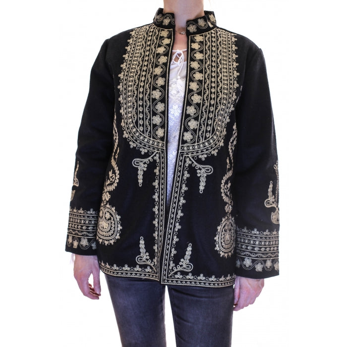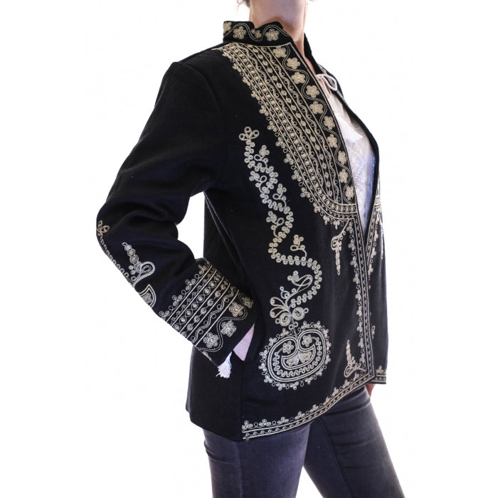 Sacou lung si drept, din stofa cu 58% lana in compozitie, captuseala din bumbac, buzunare laterale.