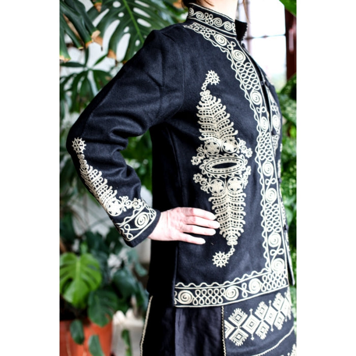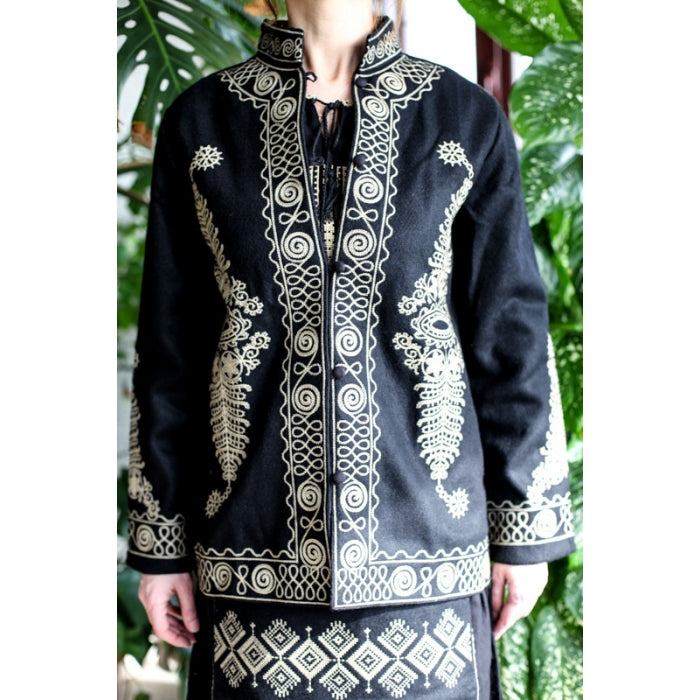 Sacou lung si drept, din stofa cu 58% lana in compozitie, captuseala din bumbac, buzunare laterale.
