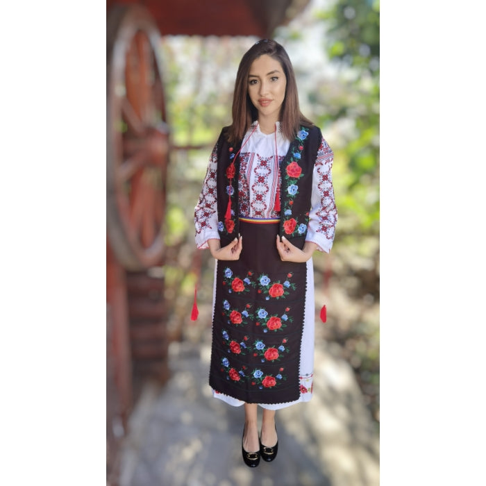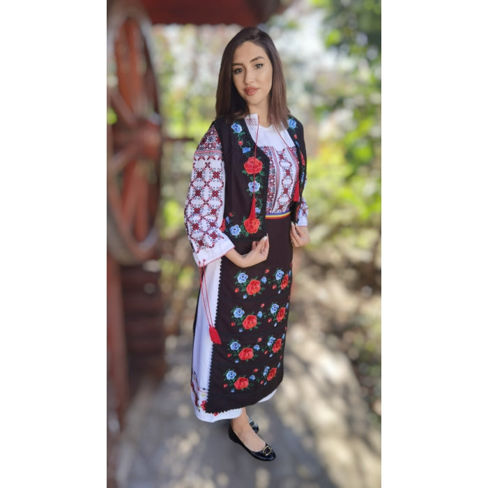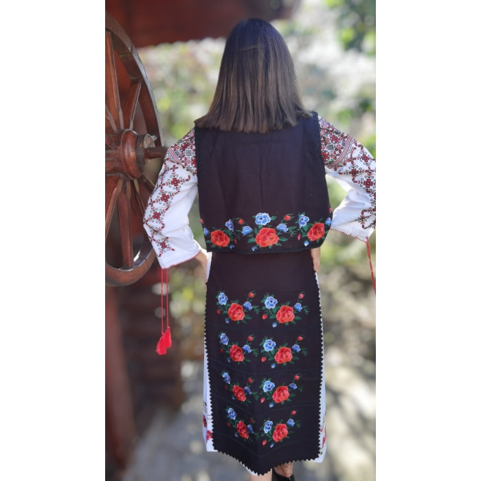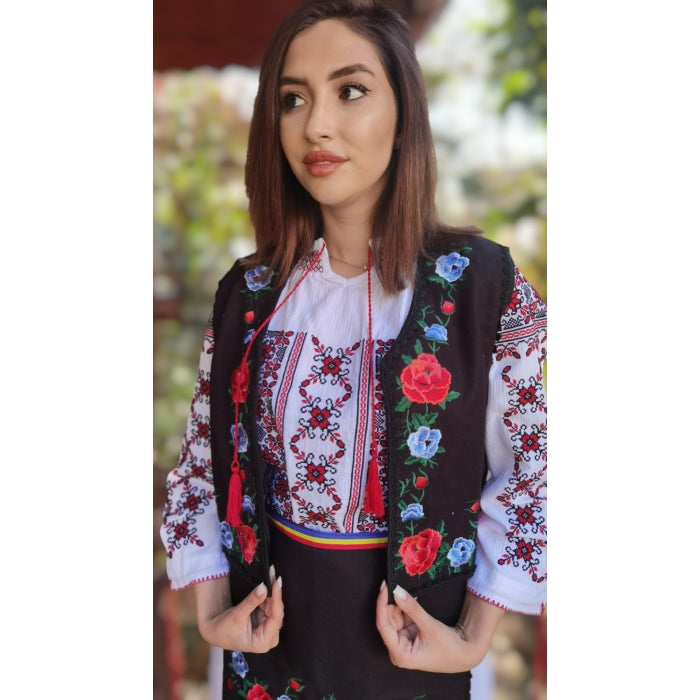 Vestă: Realizată din material textil, stofa cu broderie colorată, oferind un look elegant și tradițional.