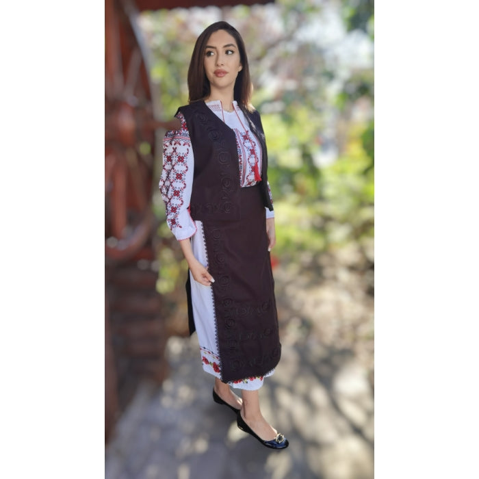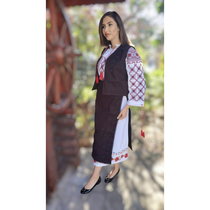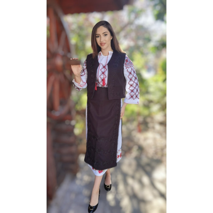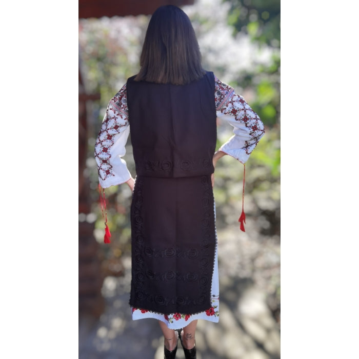 Vestă: Realizată din material textil, stofa cu broderie colorată, oferind un look elegant și tradițional.