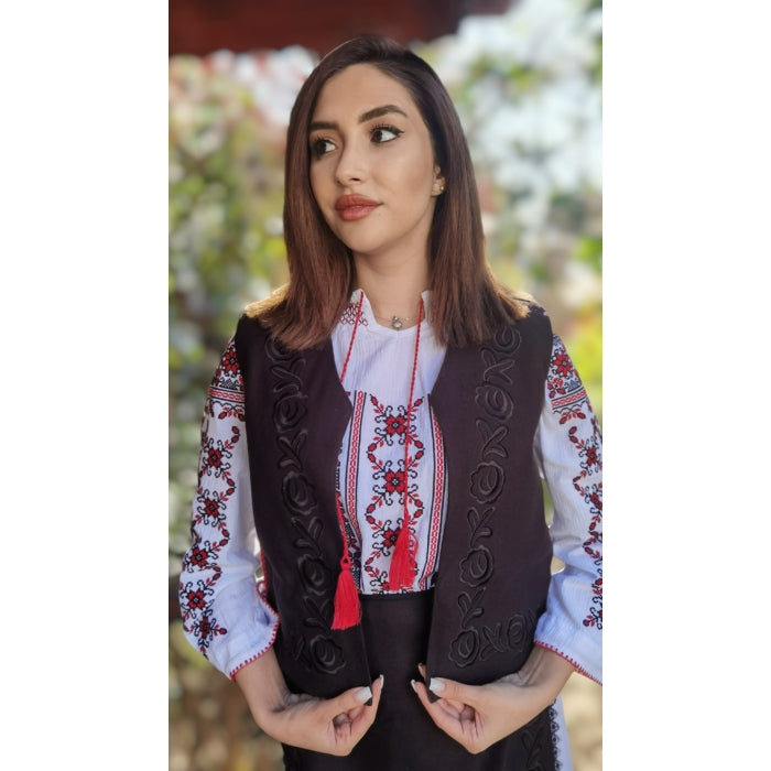 Design Elegant: Vesta este decorată cu broderii tradiționale, iar fota completează perfect aspectul.