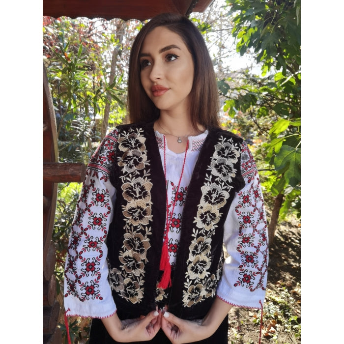 Vestă: Realizată din material textil, catifea cu broderie bej auriu, oferind un look elegant și tradițional.