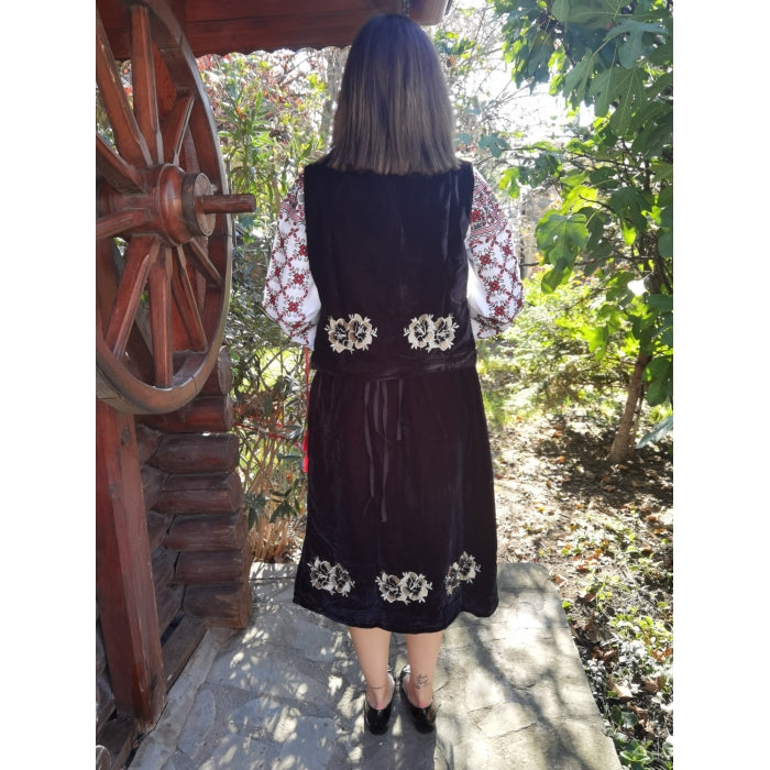 Fusta este confecționată din catifea, cu motive florale brodate, pentru un aspect autentic, cu jupa la interior, iar talia este pe elastic, permite o intindere mai mare.