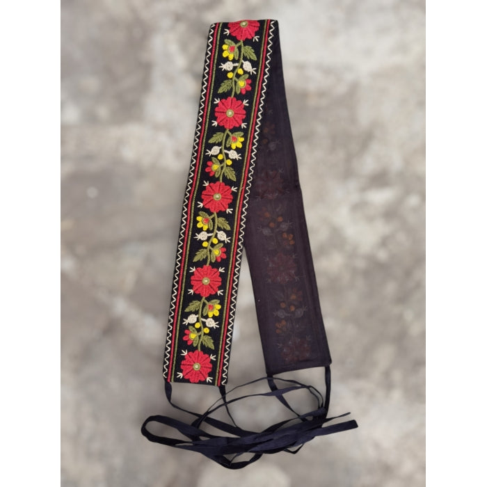 Brau: marime univresala, prindere ajustabila cu snur, material bumbac cu broderie cusuta la masina, latime 15 cm, lungime 89 cm (fara snur).
