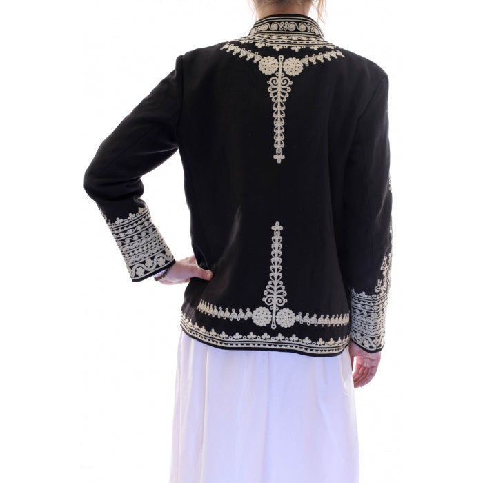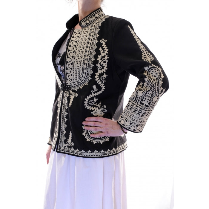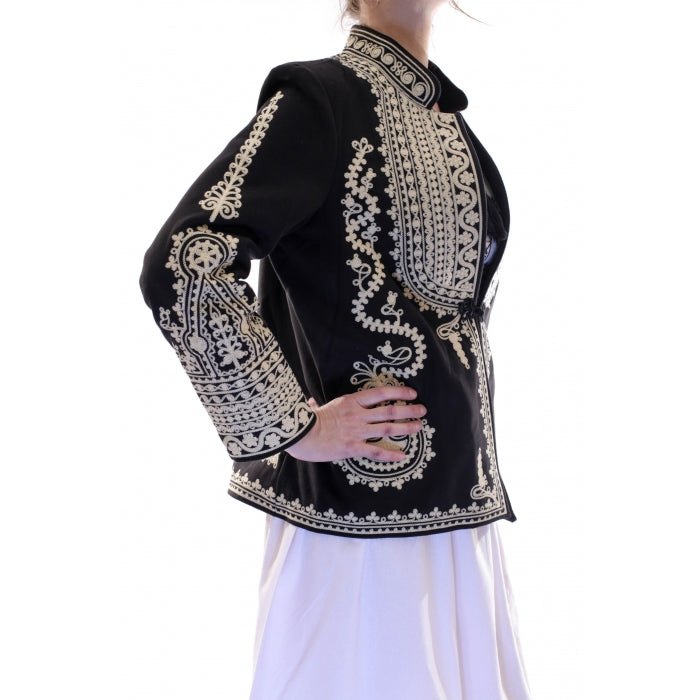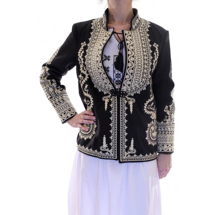 Suman scurt si drept, din stofa cu fire de lana in compozitie, captuseala sintetica. Model unisex. Broderie cusuta la masina.