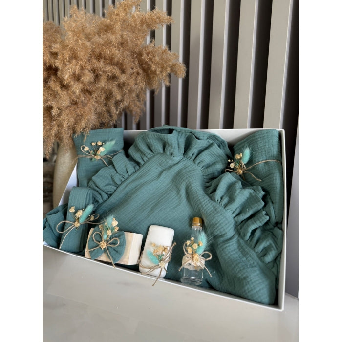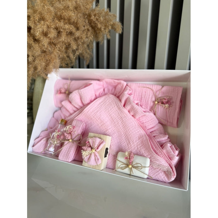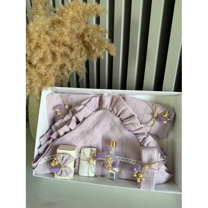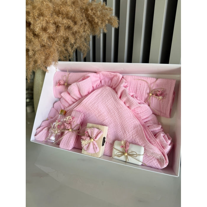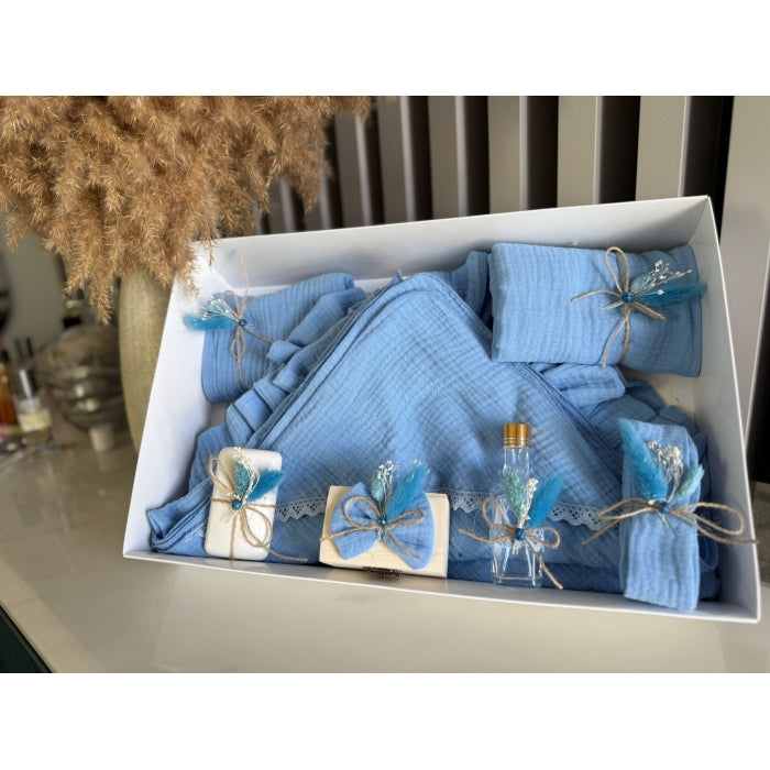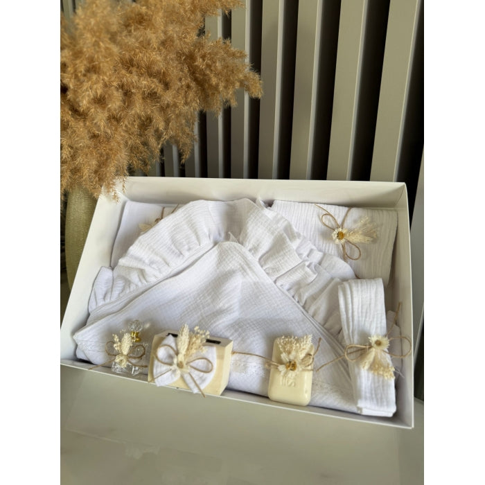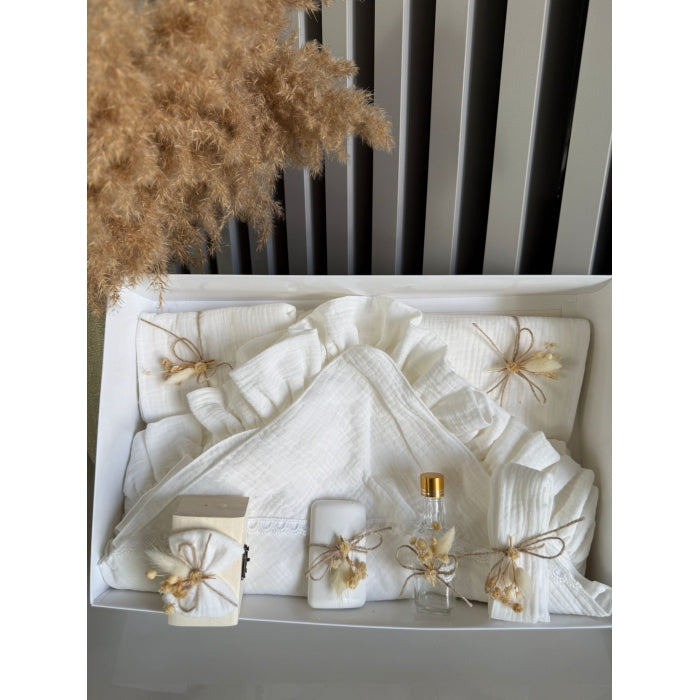 Trusou botez muselină 8 piese, complet, cu cufăr prima șuviță și sticluță ulei