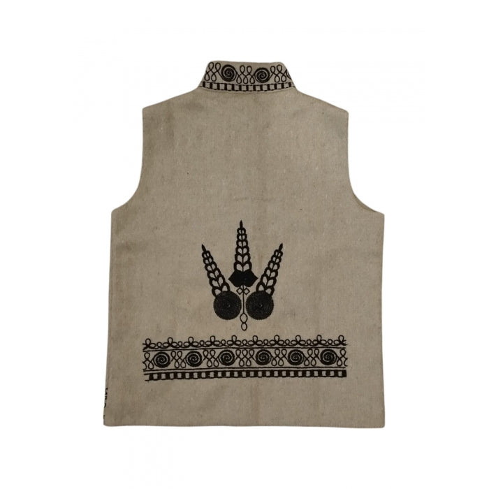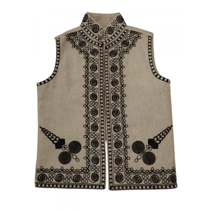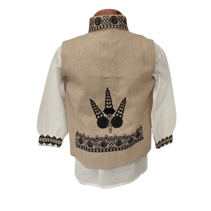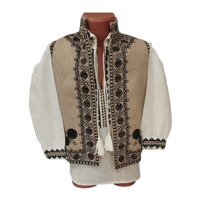 Vesta traditionala pentru baieti are o croiala simpla, cu un croi drept. Este realizata din lana sau amestec de lana, si are un imprimeu brodat romanessc cu motive geometrice, brodat la masina. Vesta este disponibila in diverse culori, cum ar fi bej cu broderie neagra.