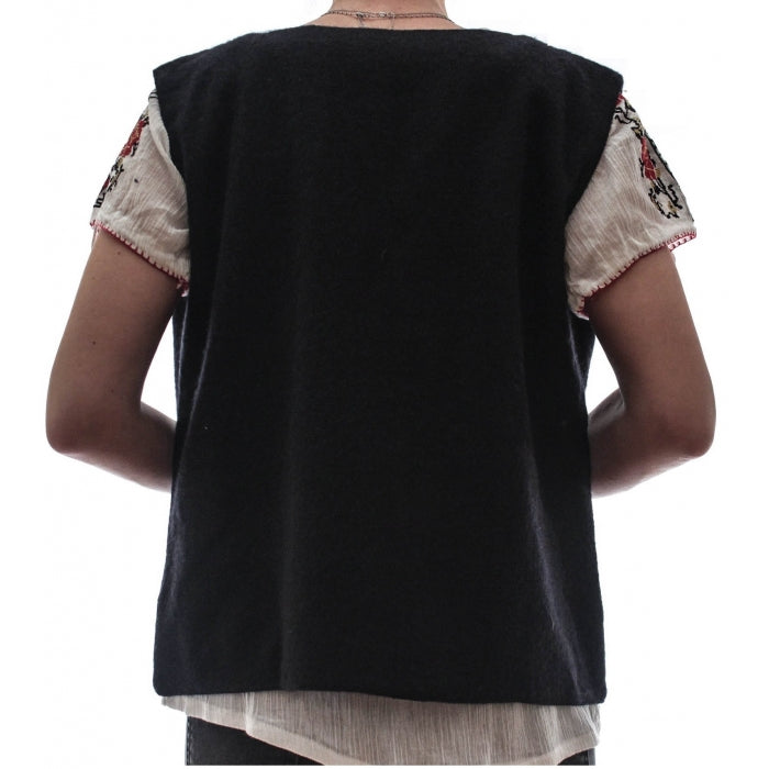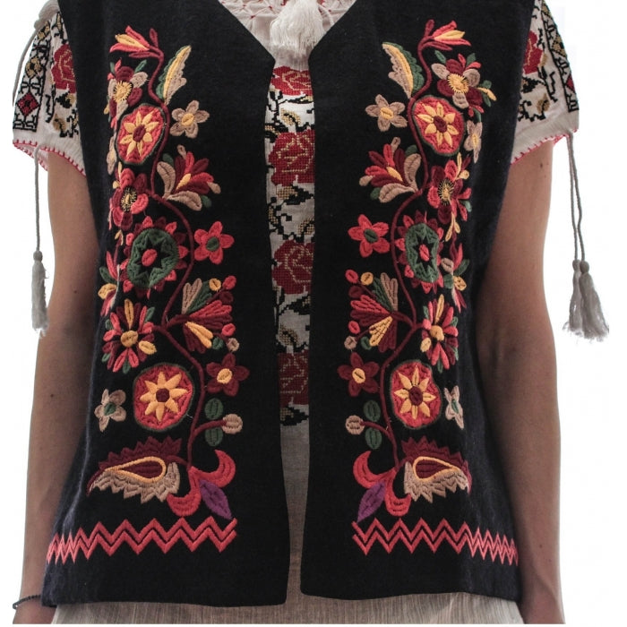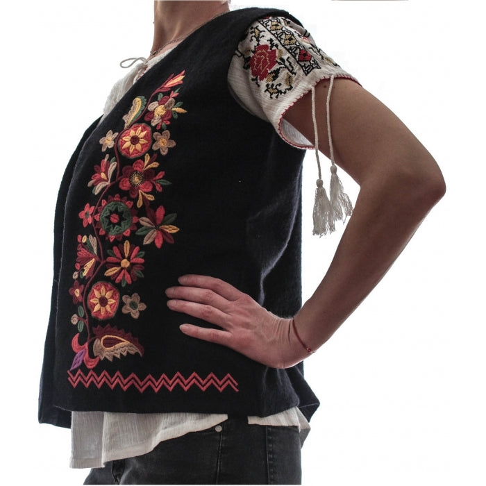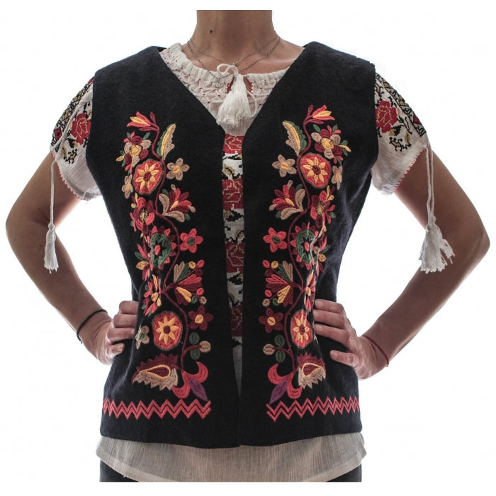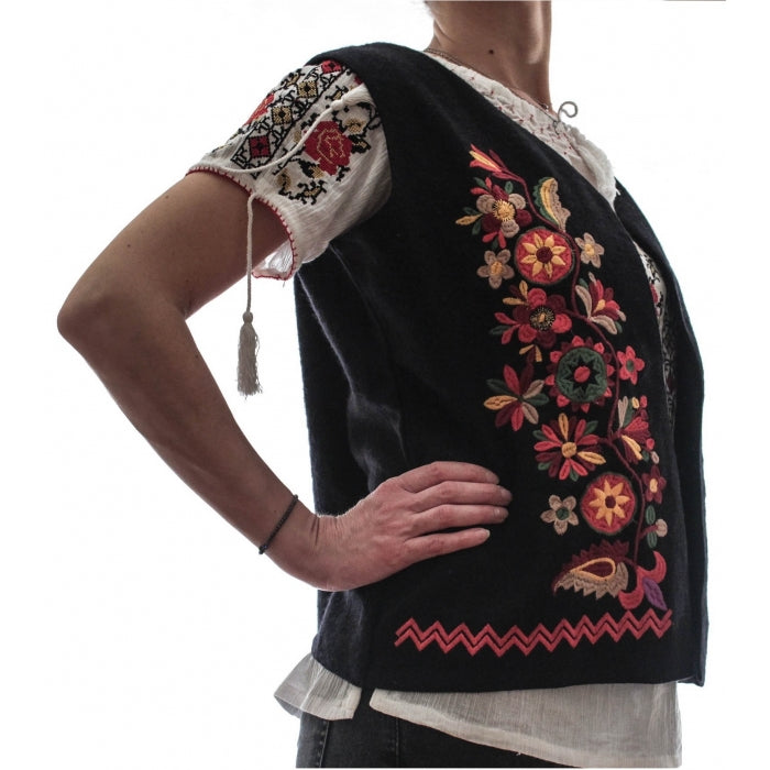 Material: lana 58%, poliester 25%, acrilic 8%, nylon 7%, vascoza 1%, bumbac 1%. Broderie cusuta la masina. Captuseala din bumbac.