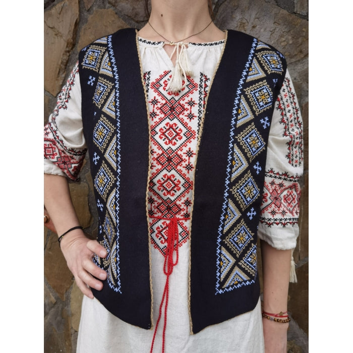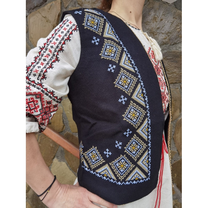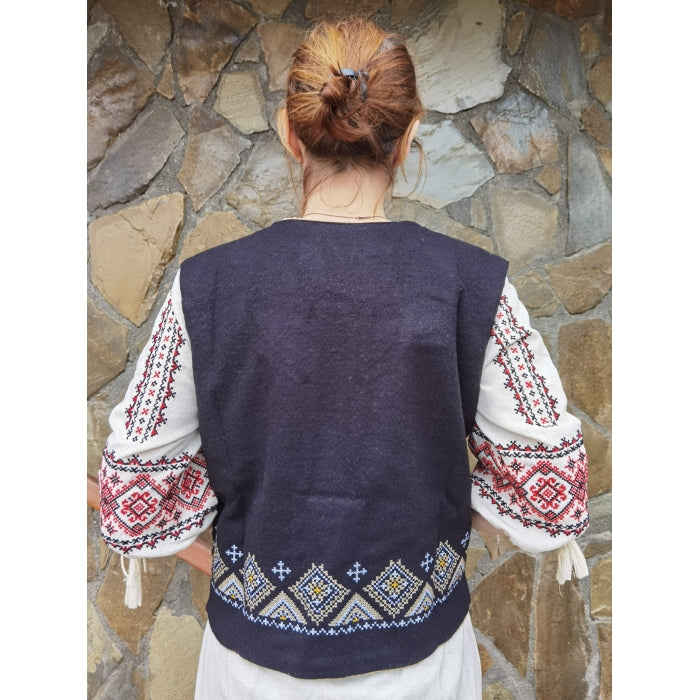 Material: stofa lana 58%, poliester 25%, acrilic 8%, nylon 7%, vascoza 1%, bumbac 1%. Broderie cusuta la masina. Captuseala din bumbac, buzunare laterale. In funtie de lot broderia pe spate poate sa fie doar in partea de jos.