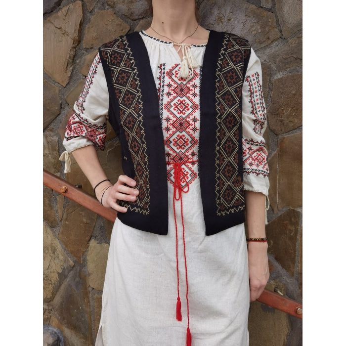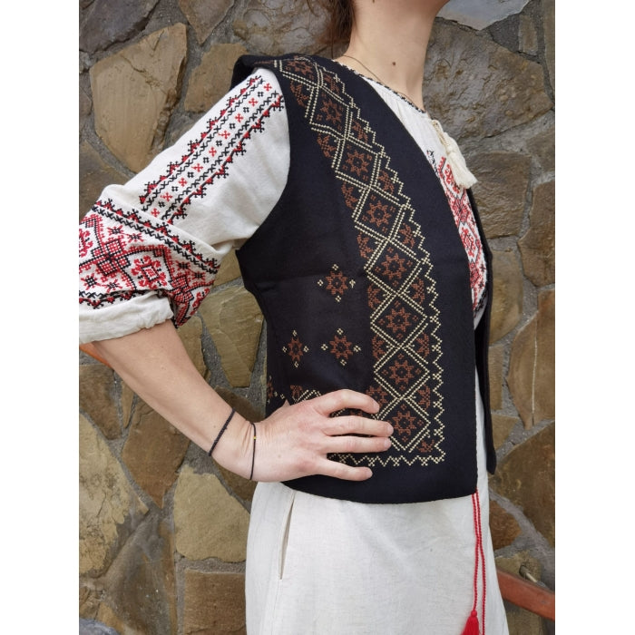 Material: stofa lana 58%, poliester 25%, acrilic 8%, nylon 7%, vascoza 1%, bumbac 1%. Broderie cusuta la masina. Captuseala din bumbac, buzunare laterale. In funtie de lot broderia pe spate poate sa fie doar in partea de jos.