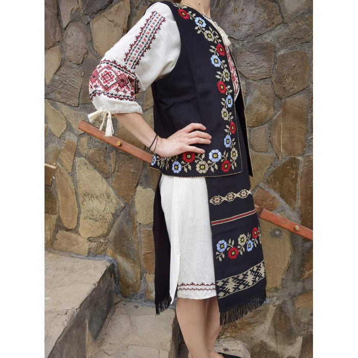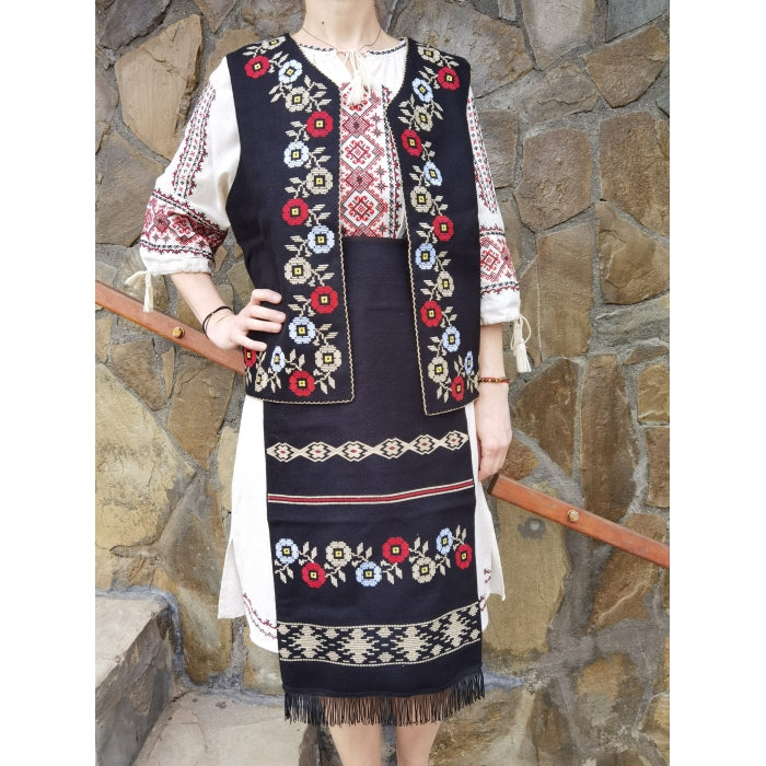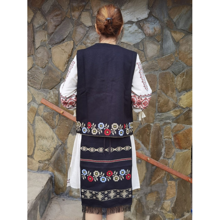 Material: stofa lana 58%, poliester 25%, acrilic 8%, nylon 7%, vascoza 1%, bumbac 1%. Broderie cusuta la masina. Captuseala din bumbac, buzunare laterale. In funtie de lot broderia pe spate poate sa fie doar in partea de jos.