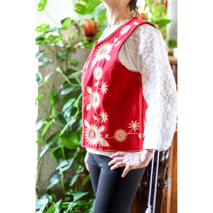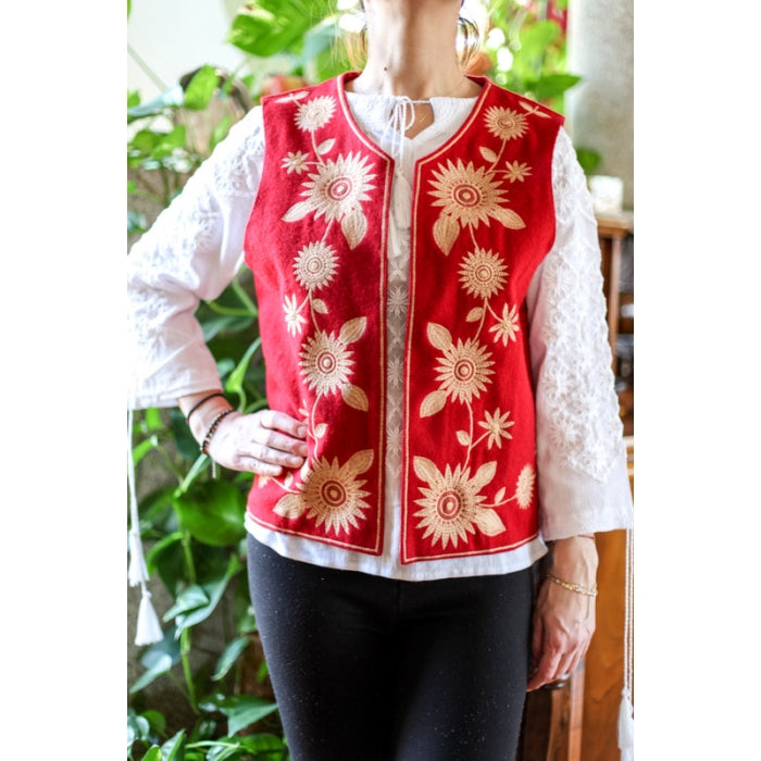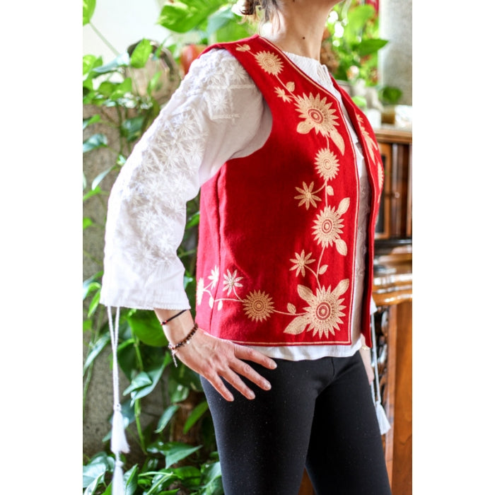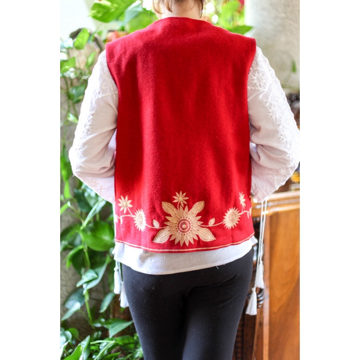 Material: lana 58%, poliester 25%, acrilic 8%, nylon 7%, vascoza 1%, bumbac 1%. Broderie cusuta la masina. Captuseala din bumbac, buzunare laterale.