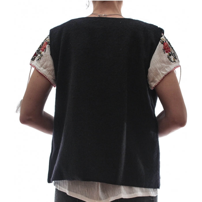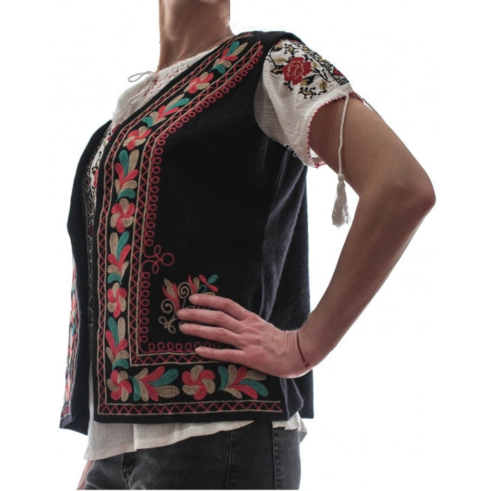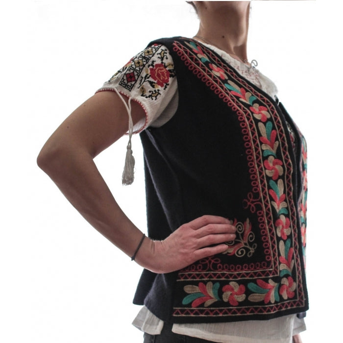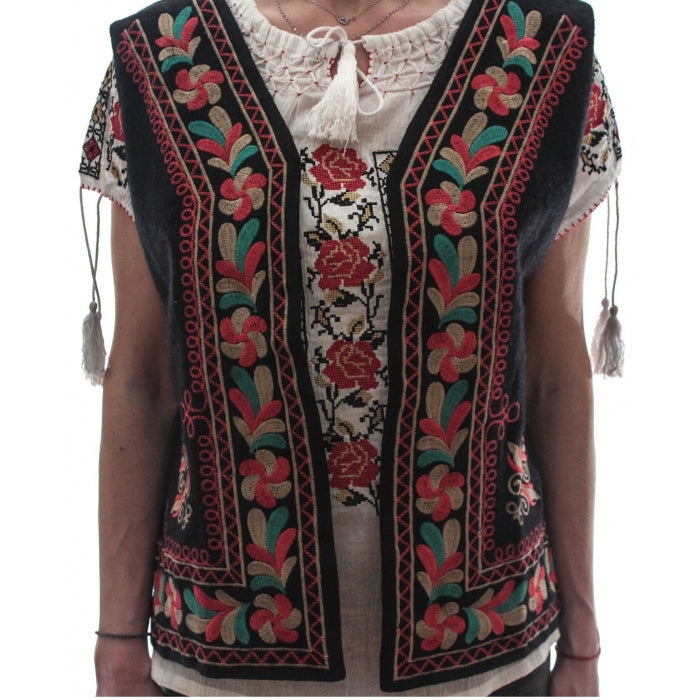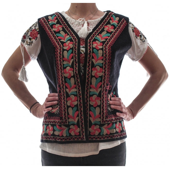 Material: lana 58%, poliester 25%, acrilic 8%, nylon 7%, vascoza 1%, bumbac 1%. Broderie cusuta la masina. Captuseala din bumbac.