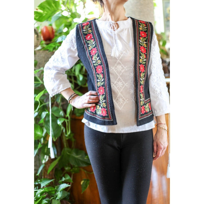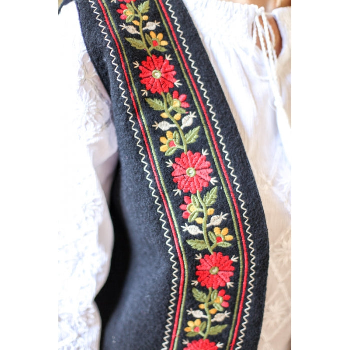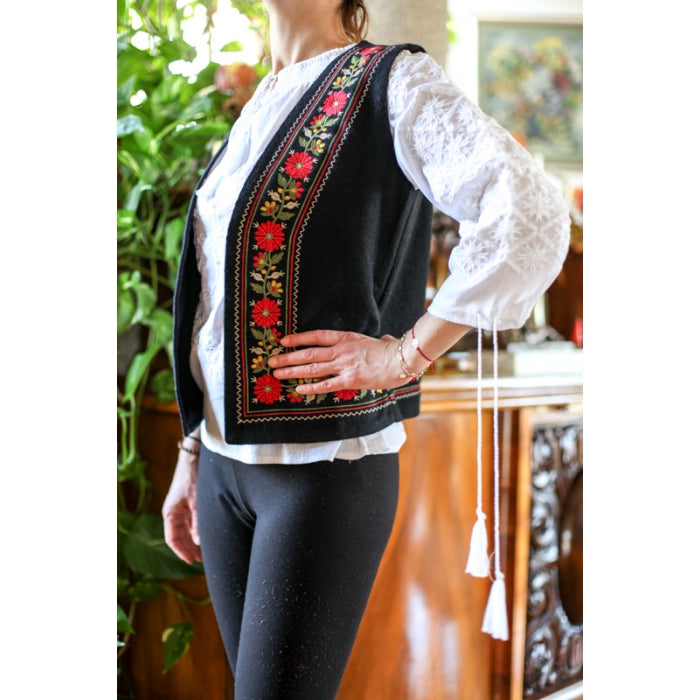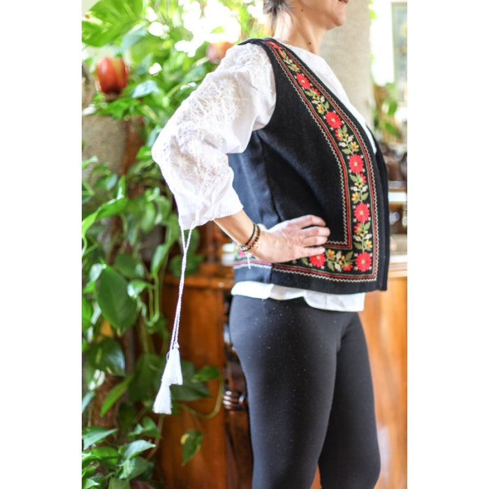 Material: lana 58%, poliester 25%, acrilic 8%, nylon 7%, vascoza 1%, bumbac 1%. Broderie cusuta la masina. Captuseala din bumbac, buzunare laterale.
