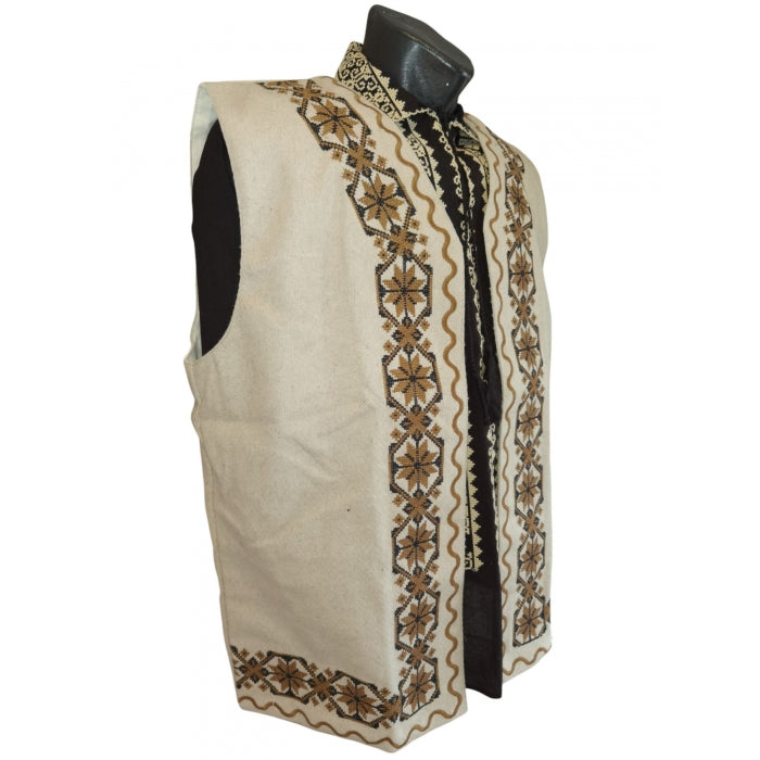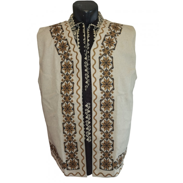 Materiale de Calitate: Realizată din materiale de cea mai înaltă calitate, această vestă se remarcă prin durabilitate și confort, Vesta bej cu motive traditionale pentru barbati cu model traditional brodat la masina,cu broderie bej. Material amestec stofa, lana. Captuseala din bumbac